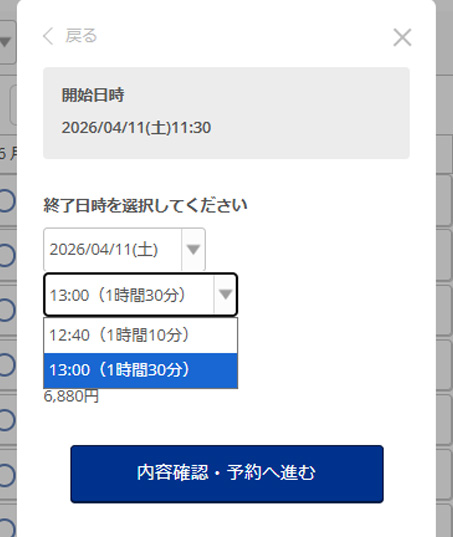ウェブ予約の際、図のように1時間30分をお選びください。受付・お着替えの時間も含まれています。施術は60分+20分で80分となります。